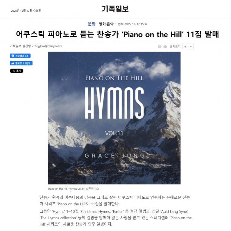 [기사] 어쿠스틱 피아노로 듣는 찬송가 ‘Piano on the Hill’ 11집 발매(기독일보)