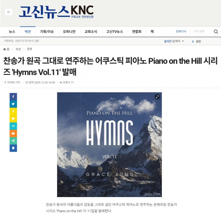 [기사] 찬송가 원곡 그대로 연주하는 어쿠스틱 피아노 Piano on the Hill 시리즈 'Hymns Vol.11' 발매(고신뉴스 KNC)