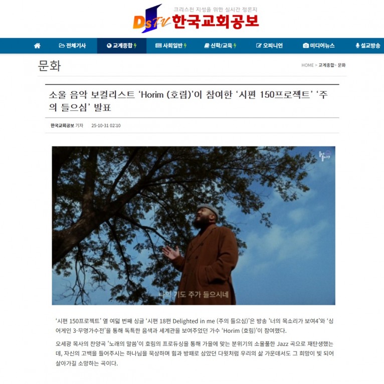 [기사] 소울 음악 보컬리스트 ‘Horim (호림)’이 참여한 ‘시편 150프로젝트’ ‘주의 들으심’ 발표(한국교회공보)