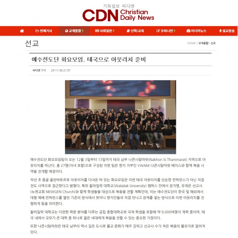 [기사] 예수전도단 화요모임, 태국으로 아웃리치 준비(기독일보 씨디엔)